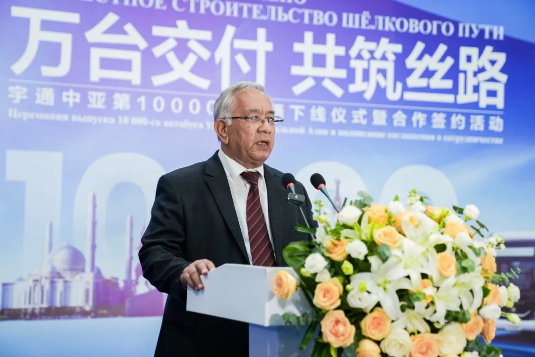 本次出口中亚第10000台车辆的成功下线,正是宇通积极参与“一带一路”建设的有力证明。活动现场,宇通客车中亚区总经理李海峰总结品牌深耕中亚成果。他表示,自共建“一带一路”倡议提出以来,中国与中亚国家的合作不断深化。多年来,宇通与中亚地区客户的合作,不仅带来了高品质的公共交通产品,更重要的是带来了理念、技术、标准的融合与共建。接下来,宇通将以本次“万台交付”为契机,继续发挥技术引领与系统集成优势,助力中亚国家实现更高水平的城市交通现代化。