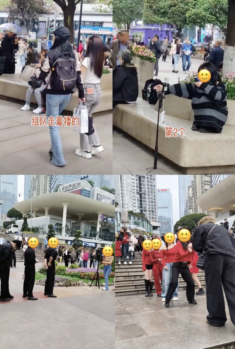 主播一边表演才艺,一边将镜头肆意扫向过往的行人,屏幕内的观众则借此对着路人的穿着、样貌、身材乃至同行者关系,进行肆意地点评与打分。