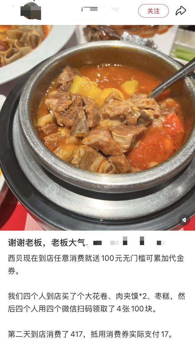 一位网友发文称,“西贝现在到店任意消费就送100元无门槛可累加代金券。我们四个人到店买了个大花卷、肉夹馍*2、枣糕,然后四个人用四个微信扫码领取了4张100块。第二天到店消费了417元,抵用消费券实际支付17元。”