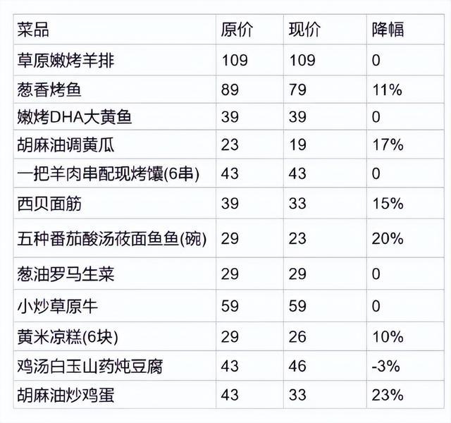 10月1日,西贝官方小程序显示,菜品价格已完成调改。以此前罗永浩就餐时的账单为例,草原嫩烤羊排原价119元,现价109元;葱香烤鱼原价89元现价79元;黄米凉糕(6块)原价29元现价26元。