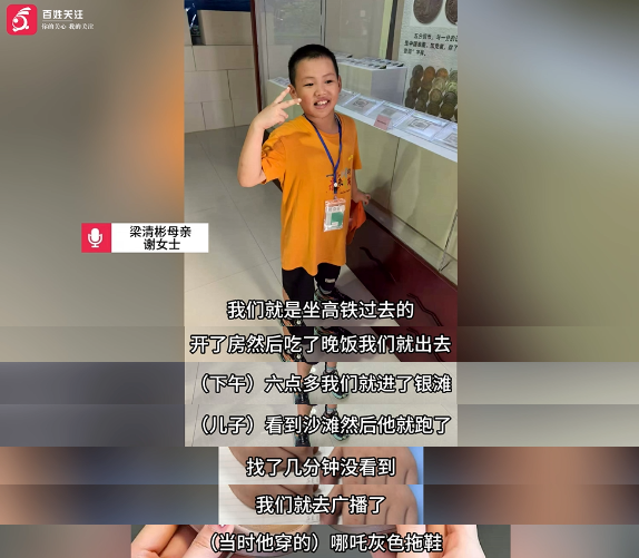 10月1日,其母谢女士告诉《百姓关注》记者,当天全家从贵港赴北海旅游,傍晚在沙滩游玩时孩子奔跑消失,仅几分钟后便不见踪影。