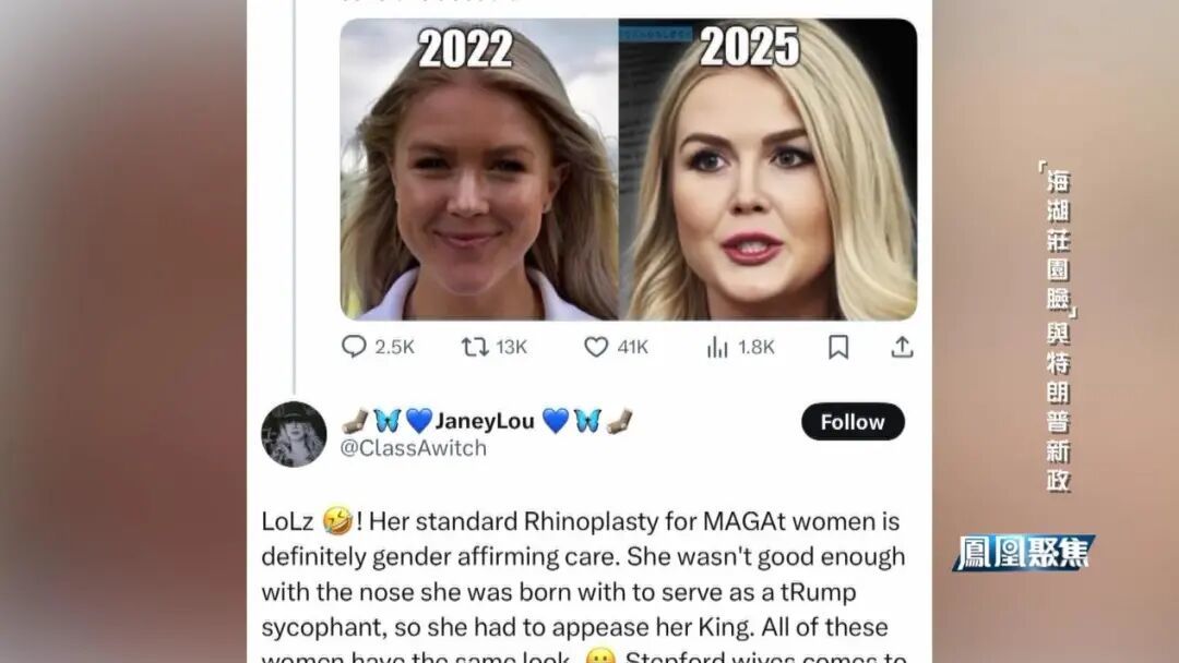 据美国《好莱坞报道者》、《周刊杂志》、《纽约邮报》等多家美国媒体报道,特朗普核心圈的“几位女性”近期都接受了整容手术。而男政客也不落人后,前共和党众议员马特·盖茨在去年的共和党大会上,就以棱角分明、颧骨饱满、面部僵硬的新造型亮相。整形医生分析,他注射了大量肉毒杆菌和填充物,而副总统万斯就疑似给自己画了眼线。不久前,两位美国网红搞了个节目,专门聊美国副总统万斯的眼线,围观人数超过百万次。