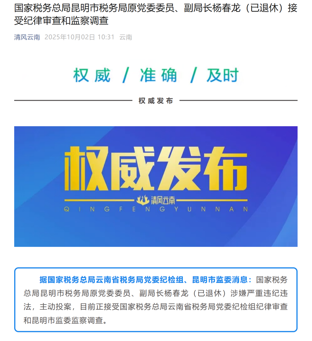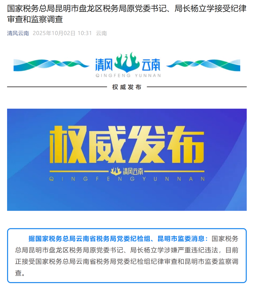 10月2日,据国家税务总局云南省税务局党委纪检组、昆明市监委消息: