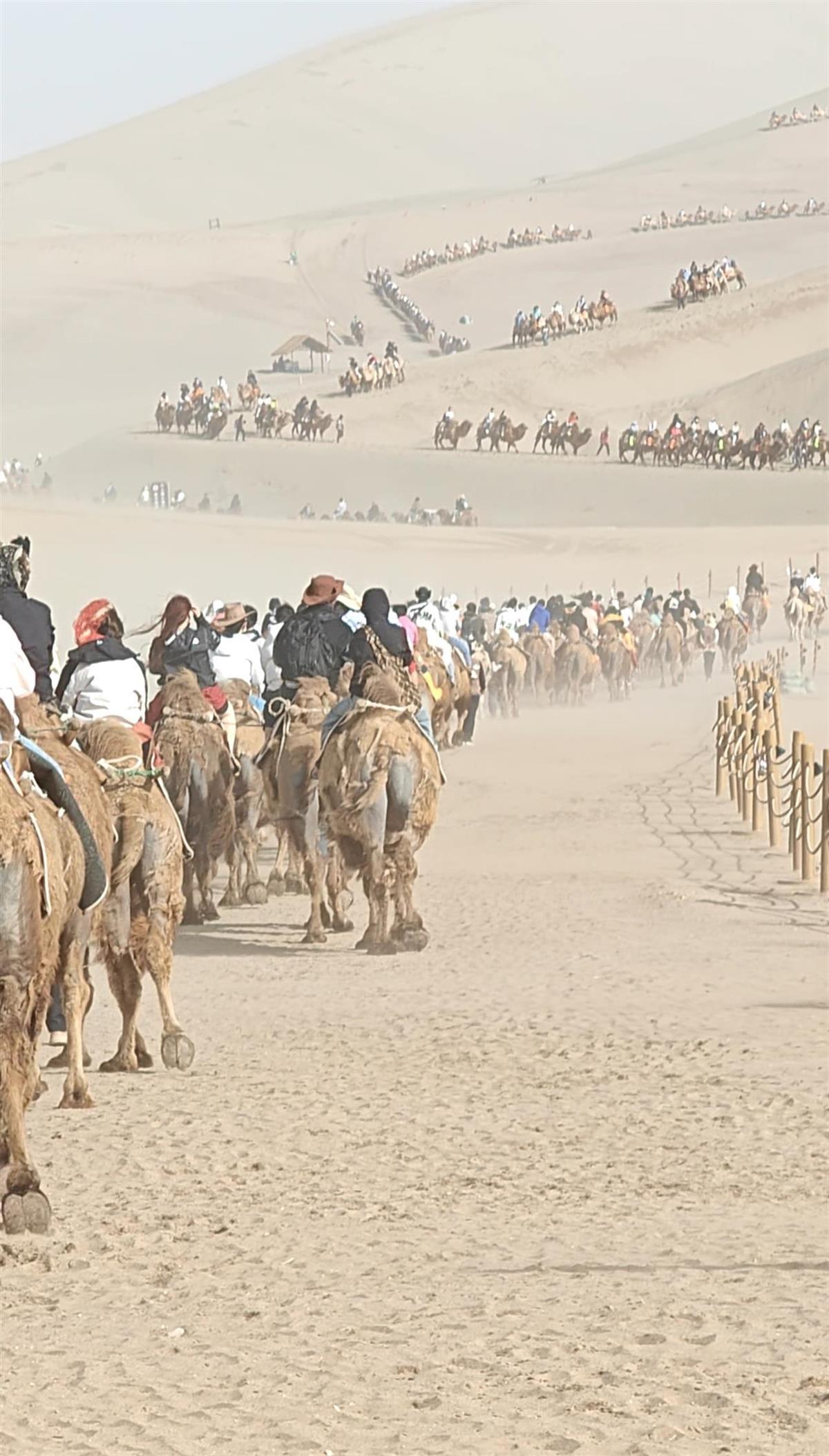 甘肃本地游客“霞霞”感叹道:“骆驼队蜿蜒前行,鸣沙山的壮丽令人沉醉。”