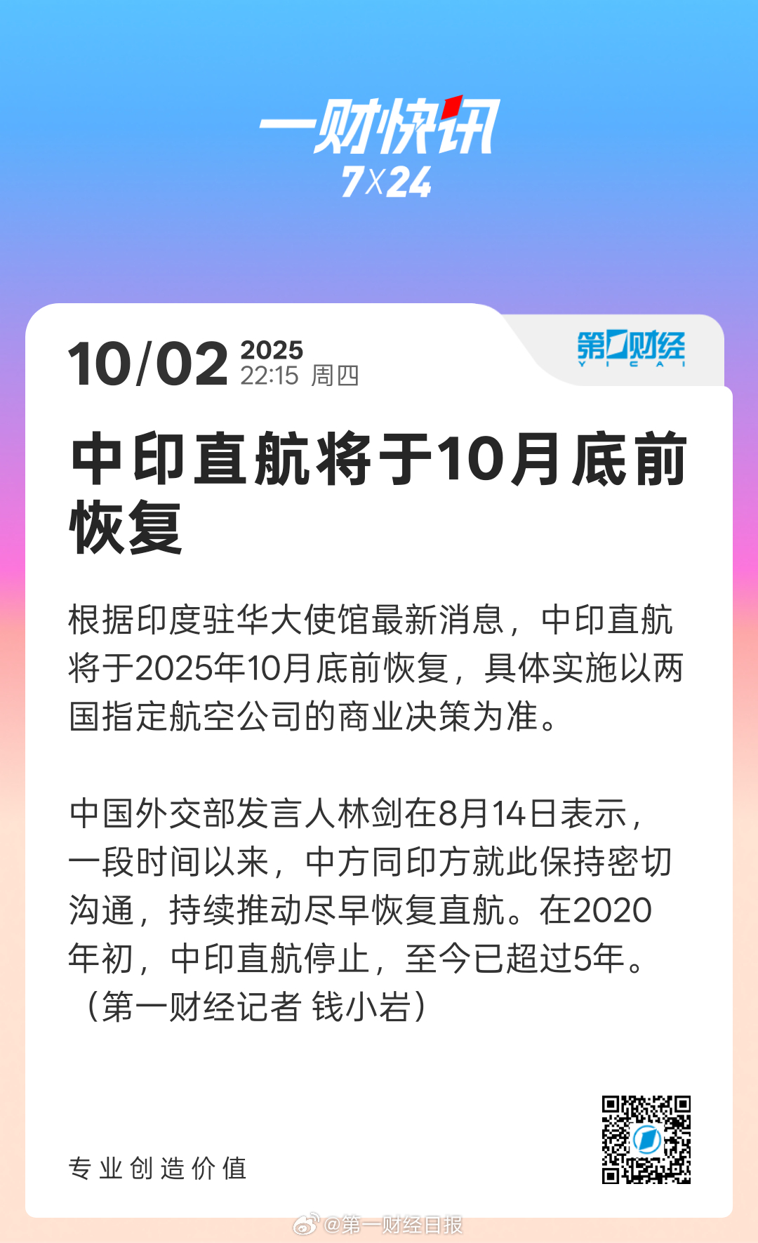 根据印度驻华大使馆最新消息,中印直航将于2025年10月底前恢复,具体实施以两国指定航空公司的商业决策为准。