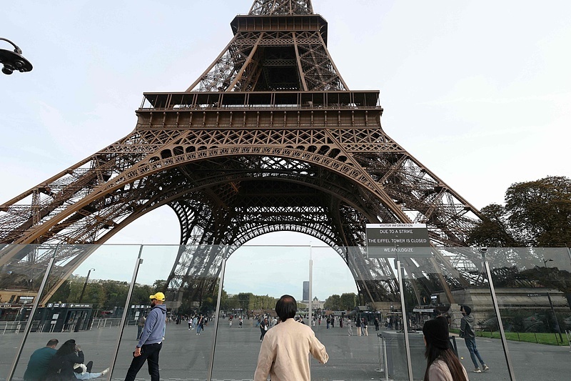 △当地时间10月2日,法国巴黎埃菲尔铁塔下,一块写有“因罢工,埃菲尔铁塔关闭,敬请谅解”的标牌。