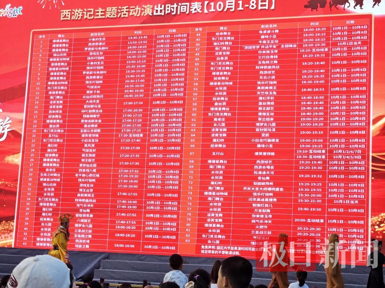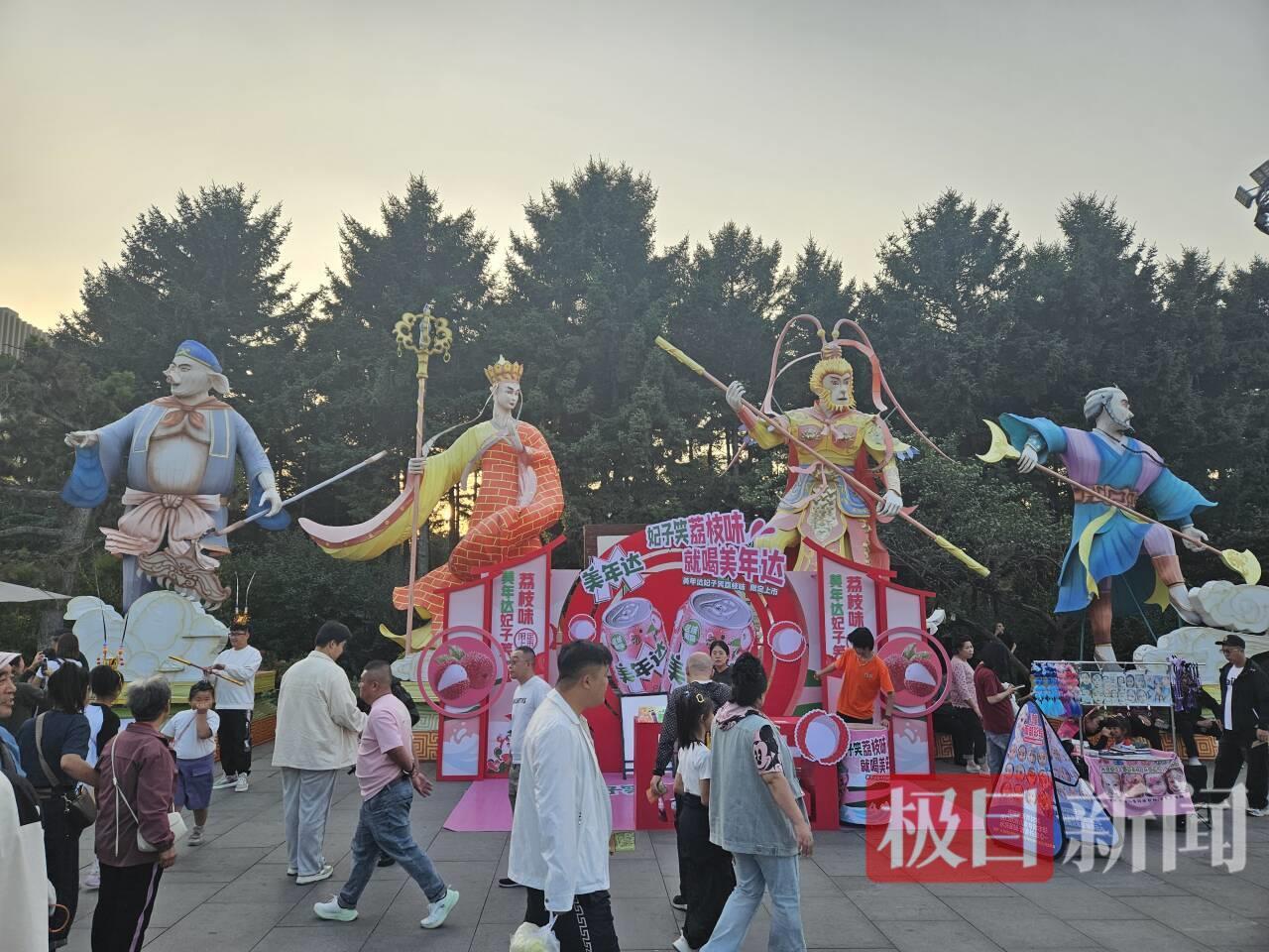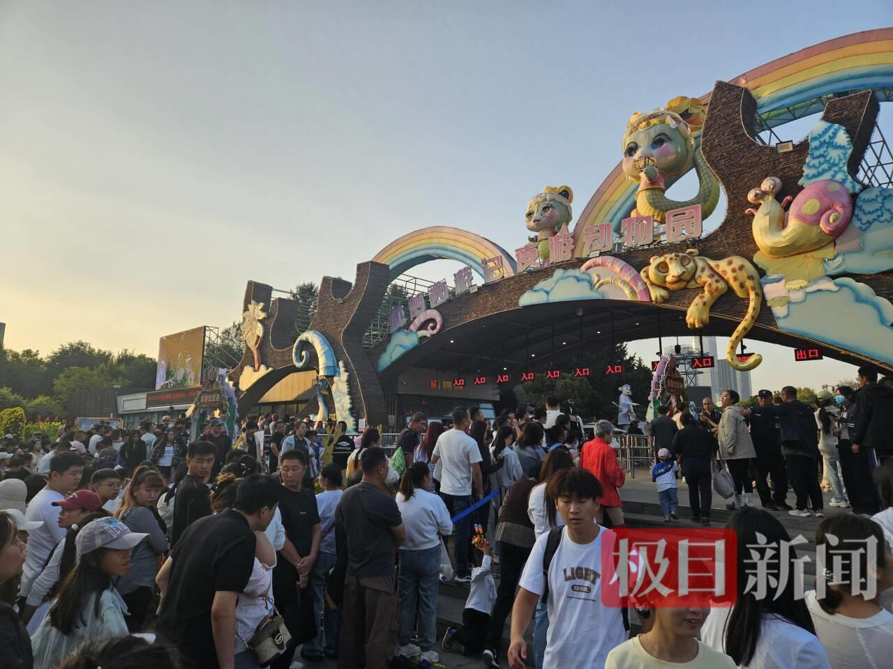 3日下午4时,极目新闻记者来到长春市动植物园,门外排着几层的百米长队,不少游客通过线上预约提前购票,排队进园。在园区内,《西游记》主题的大型动漫卡通人物雕塑矗立,不少游客打卡拍照,一旁的海报上展示了“致敬经典 情系西游”的国庆演出节目表。