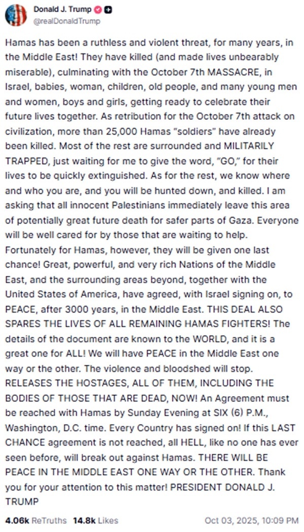 当地时间10月3日,美国总统特朗普在“真实社交”平台个人账号发文称,哈马斯还有“最后一次机会”在美东时间5日18时前接受和平协议,否则将遭受“前所未有的地狱般的打击”。