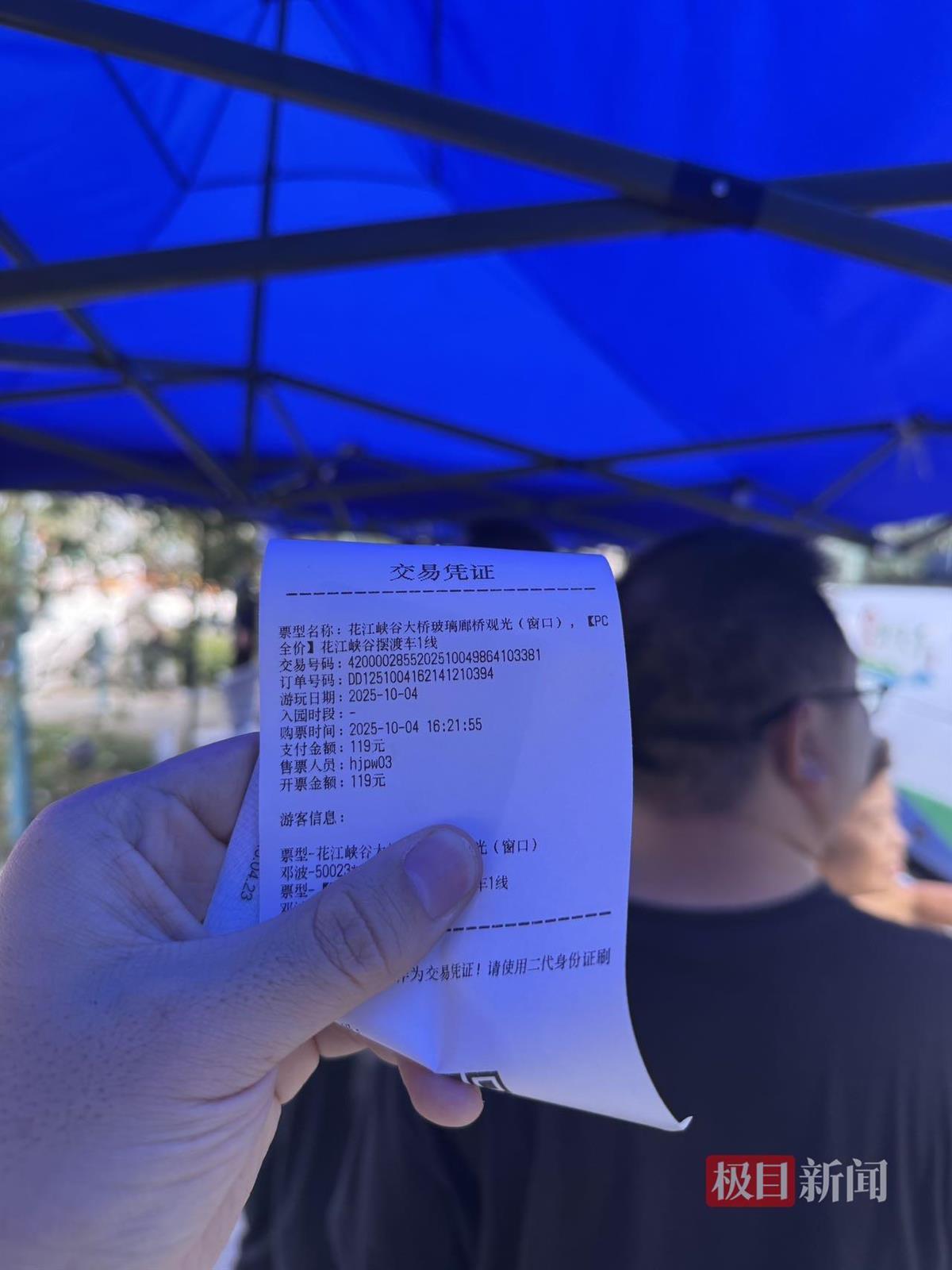 记者进入旅游区游客中心看到,停车场停满了车辆,游客人挤人。4日下午4时许,记者排队近半小时才买到票,摆渡车票20元,花江峡谷大桥玻璃廊桥观光票99元,一共119元。到了景区摆渡车排队点,记者再次排队。