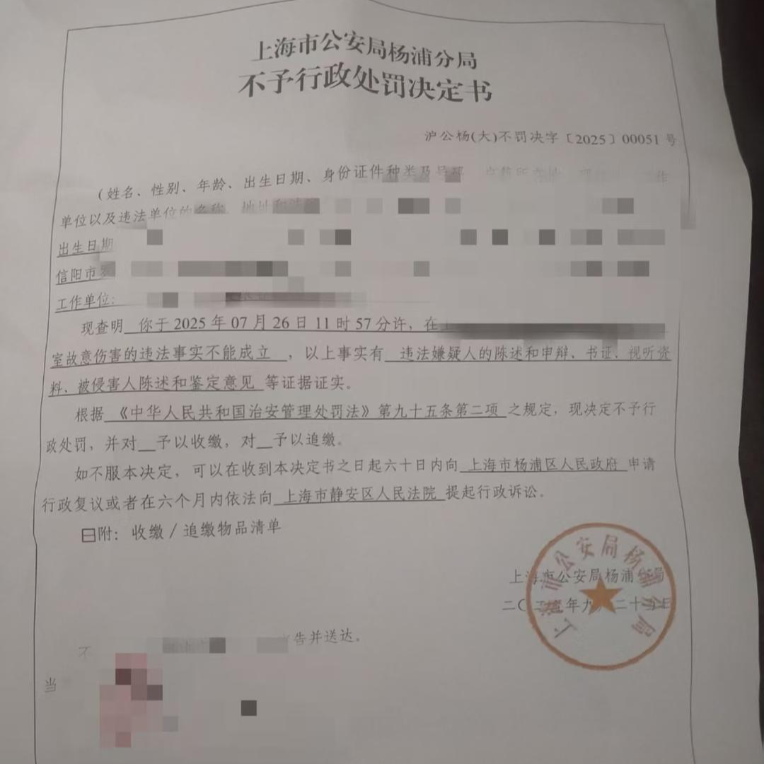 刘女士以“故意伤害”向属地警方报案后,上海市公安局杨浦分局行政立案。大约2个月后,杨浦分局下达《不予行政处罚决定书》,认为“故意伤害的违法事实不能成立”。