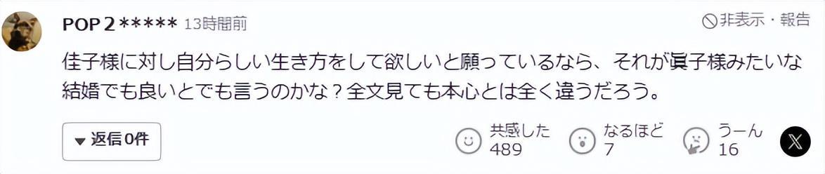这番温情脉脉的表态与她四年前对女儿婚姻的冷淡形成鲜明对比。当真子2021年执意嫁给平民小室圭时,纪子妃的态度几乎是“你选的路你自己走”。
