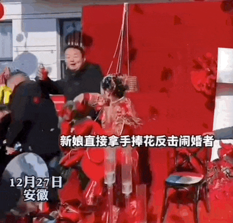 一群大妈为了抢红包,直接将新娘扑翻,场面失控。