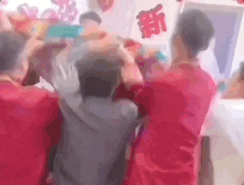 有人让新郎蹲在坑里,一盆一盆的酱油、饮料往身上泼。