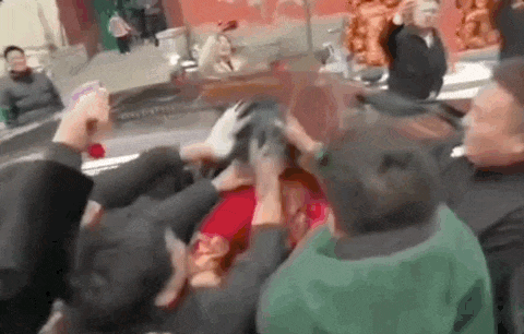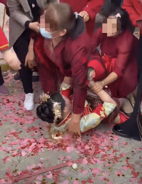 即便有人在一旁大喊——“新娘子摔了”,也没人停手。