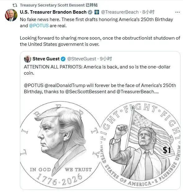 美财政部官员在社交媒体上转发了草图,称“这不是假消息”,但并未就硬币草案合法性的问题发表评论,他期待在联邦政府“停摆”结束后分享更多信息。