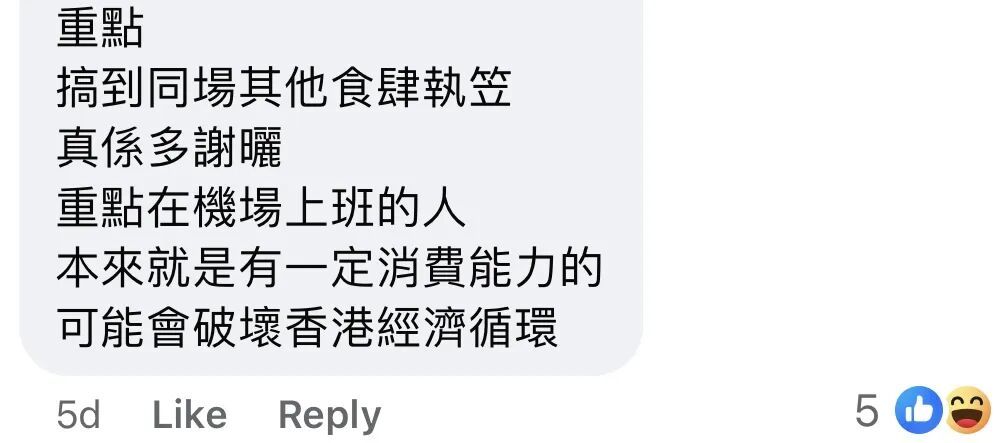 也有港人指出,在机场上班的人,本来具有一定的消费能力。出售便宜的两餸饭,可能会影响香港经济。