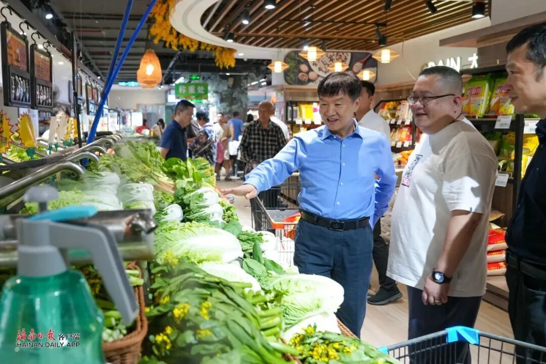 在海口市菜篮子江楠农产品批发市场、澄迈县老城镇鑫洪都购物中心、澄迈县老城镇玉堂村电力维修点、海口市迎宾大道积水点,刘小明实地查看农产品批发市场、商超保供稳价,以及村庄电力修复、城市道路排水等工作进展。