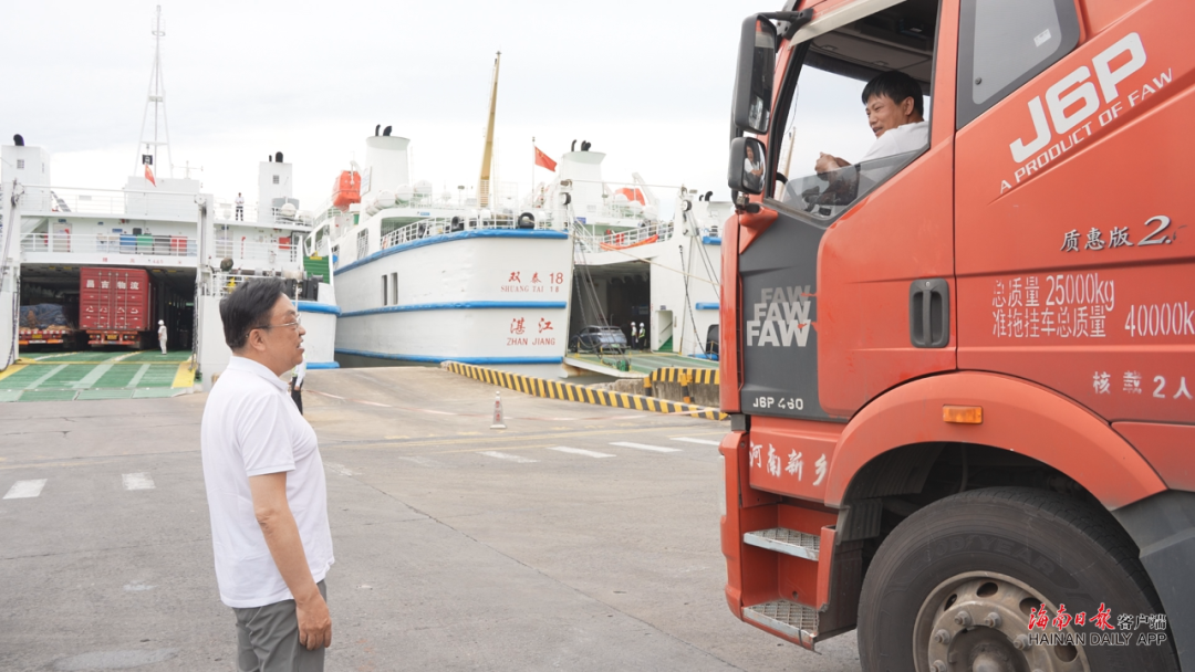 在新海港调度指挥中心,冯飞听取有关部门和单位关于琼州海峡航线复航、新能源汽车过海保障、高峰期运力保障等情况汇报。