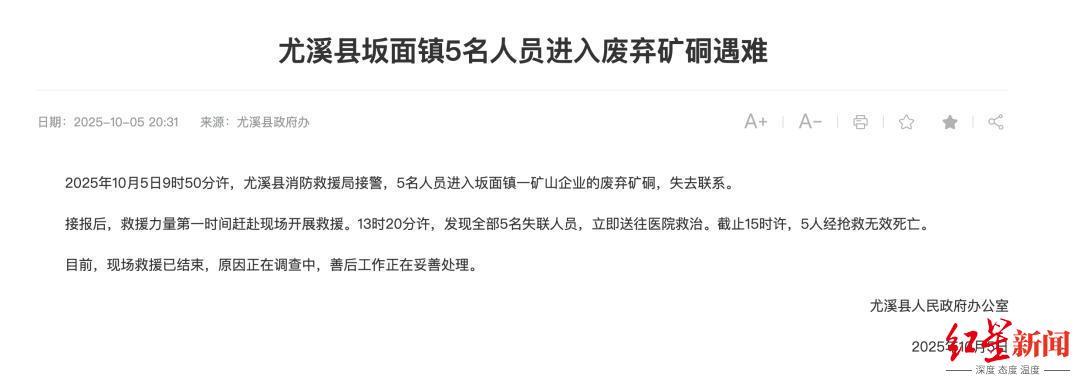 10月6日,红星新闻记者就此事致电尤溪县应急管理局,一名接线的工作人员透露,目前已由县政府牵头对此次事故成立工作专班,事故原因调查、善后工作仍在处理中。尤溪县县政府一名工作人员也向红星新闻记者证实,事发地系坂面镇肖坂村的一处废弃金矿,而该矿已关停多年,废弃矿硐硐口很早前已被封堵。
