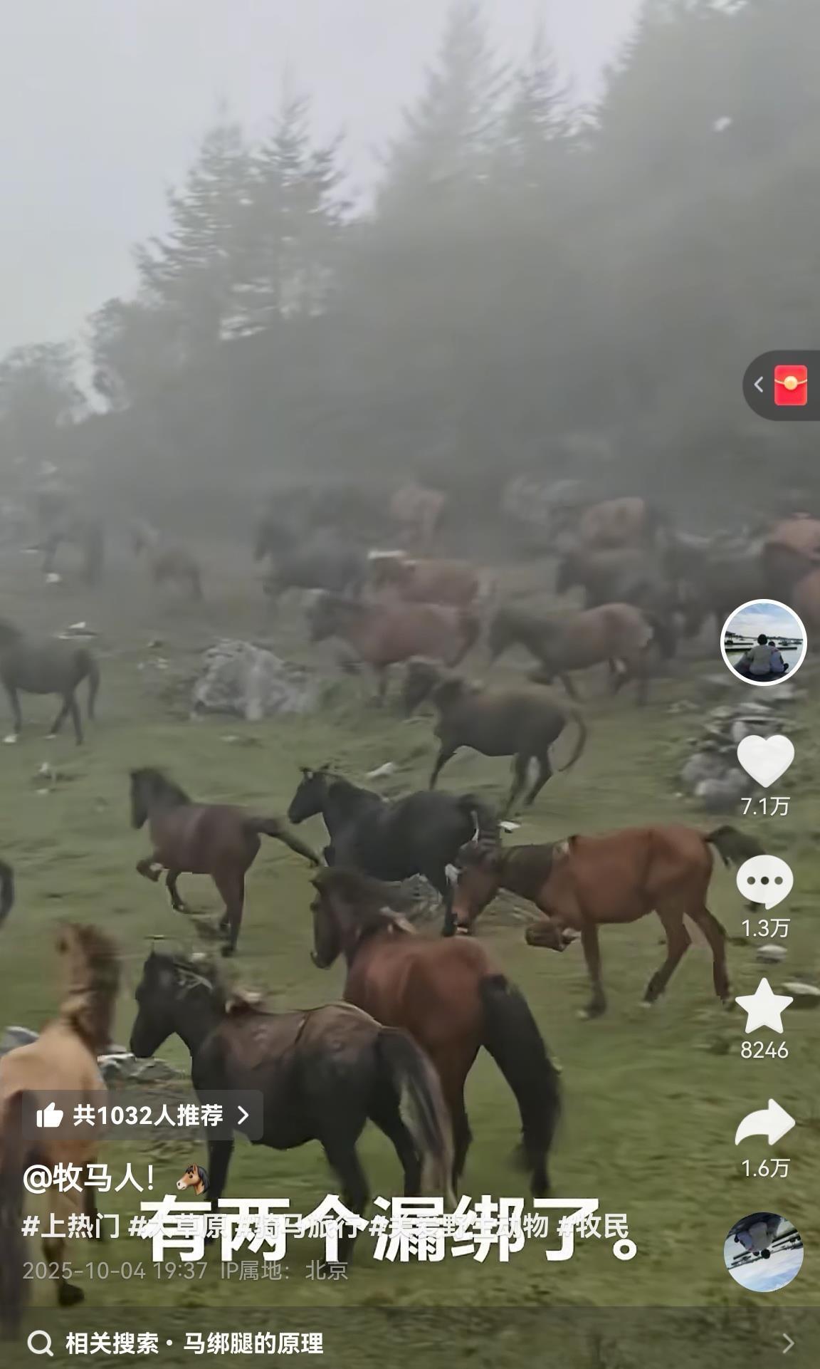 上述视频显示,数十匹马正在下山,几乎每匹马儿都被绑了左前腿或右前腿,它们都是靠其他三条腿蹒跚前行。许多网友疑问“为啥要绑”“多难受啊”。也有网友评论:“要是不绑的话,你的三万块以每小时60公里的速度离你而去……”“今天在伊犁,明天就到了拉萨”……