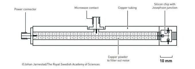 三位科学家构建了一个使用超导电路的实验装置。承载该电路的芯片尺寸约为一厘米。此前,隧穿效应和能量量子化主要在仅含少数粒子的系统中被研究;而在此实验中,这些量子现象出现在一个包含数十亿个库珀对的宏观量子系统中,这些库珀对遍布整个芯片上的超导体。因此,这项实验将量子效应从微观尺度推进到了宏观尺度。