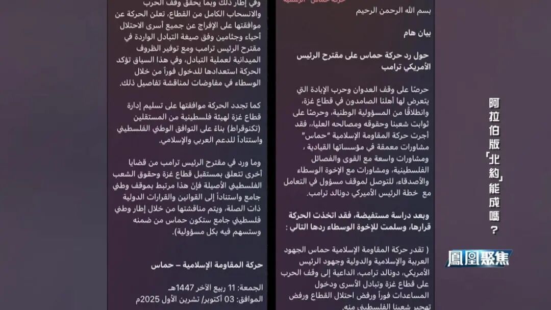 10月3日晚,哈马斯发表声明回应美国,表示愿意通过调解方进行谈判以实施相关计划,同意根据特朗普的提议释放所有以色列人质,并交出遇难者遗体,并将加沙管理权移交给一个由独立技术官僚组成的巴勒斯坦机构。