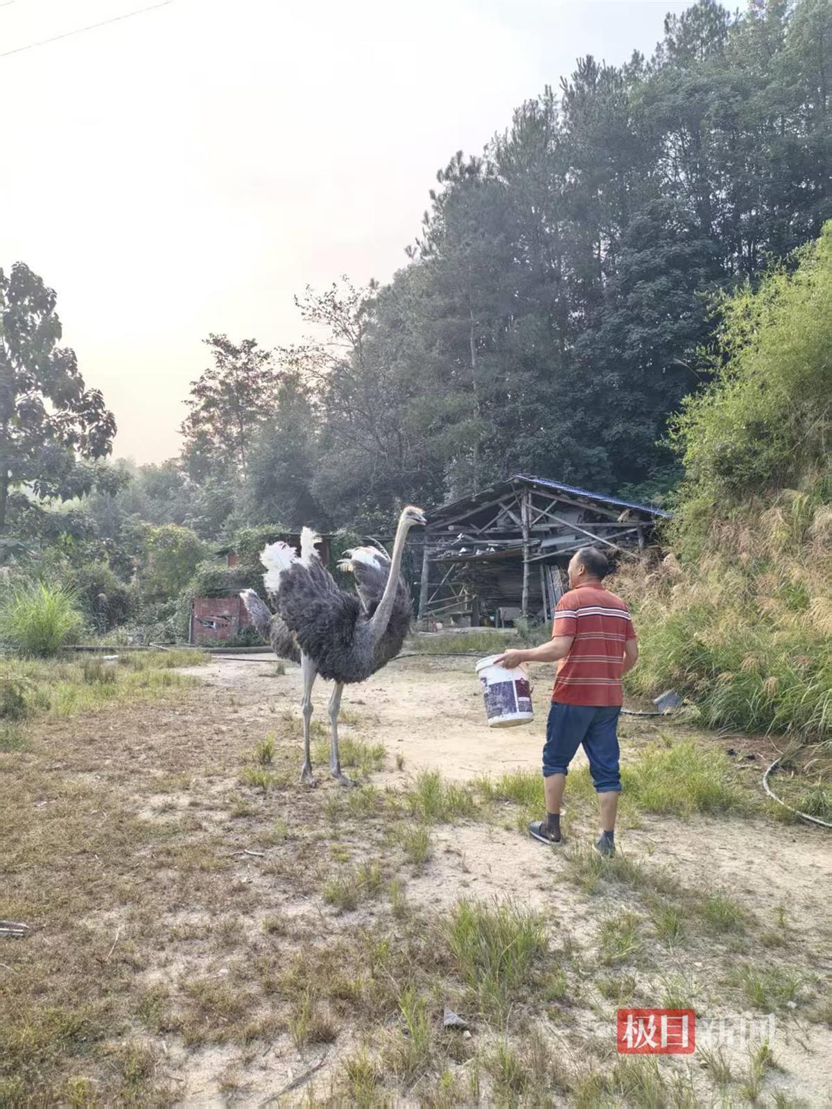 “一开始不知道它能长这么大。”何女士说,三只鸵鸟刚购入时仅两个月大,体型与成年公鸡相近;如今存活的三鸵已长成2米高、200多斤重,甚至成为全村的“景点”,每逢有村民回村探亲,家中孩子总会前来探望三鸵,并主动投喂食物。