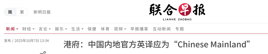 近日,香港立法会秘书处通告各部门,在对外发布的官方稿件中,“中国内地”的英文统一改为 “Chinese mainland”,不再使用 “mainland China”。