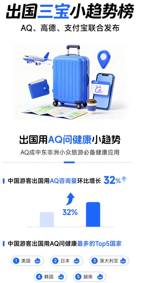 “出国三宝”(支付宝、高德、AQ)破解出境难题:高德欧洲搜公厕量增220%,覆盖30国打车服务;AQ中东、非洲健康咨询增32%,7X24小时AI急诊室解燃眉;每2名出境游客1人用支付宝,覆盖百国超1亿商户,支持即时退税,翻译机预订较8月翻番,实现“无现金、无语言障碍”出境。国际游既显双向活力,更凸显“科技+服务”新趋势。