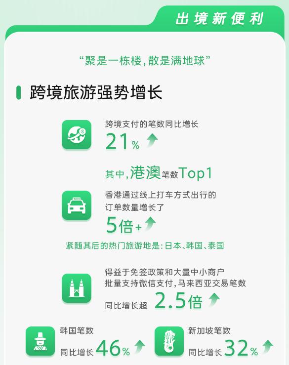 微信支付数据显示,假期前5天跨境支付笔数同比上升21%。受韩国、马来西亚、新加坡、泰国等地的对华免签政策影响,微信支付韩国的交易笔数增长46%,新加坡笔数增长32%。入境方面,微信也正成为来华外籍游客深度体验中国的新工具。国庆假期前5日,日均访问小程序的入境游用户同比增长超60%。