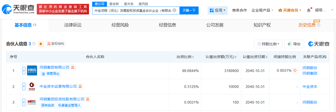 该基金由河钢集团有限公司、河钢集团投资控股有限公司、中金资本运营有限公司共同出资。其中,河钢集团作为主要出资人,认缴出资额达318.99亿元,出资比例高达99.6844%;中金资本出资比例为0.3125%;河钢集团投资控股有限公司出资比例为0.0031%。