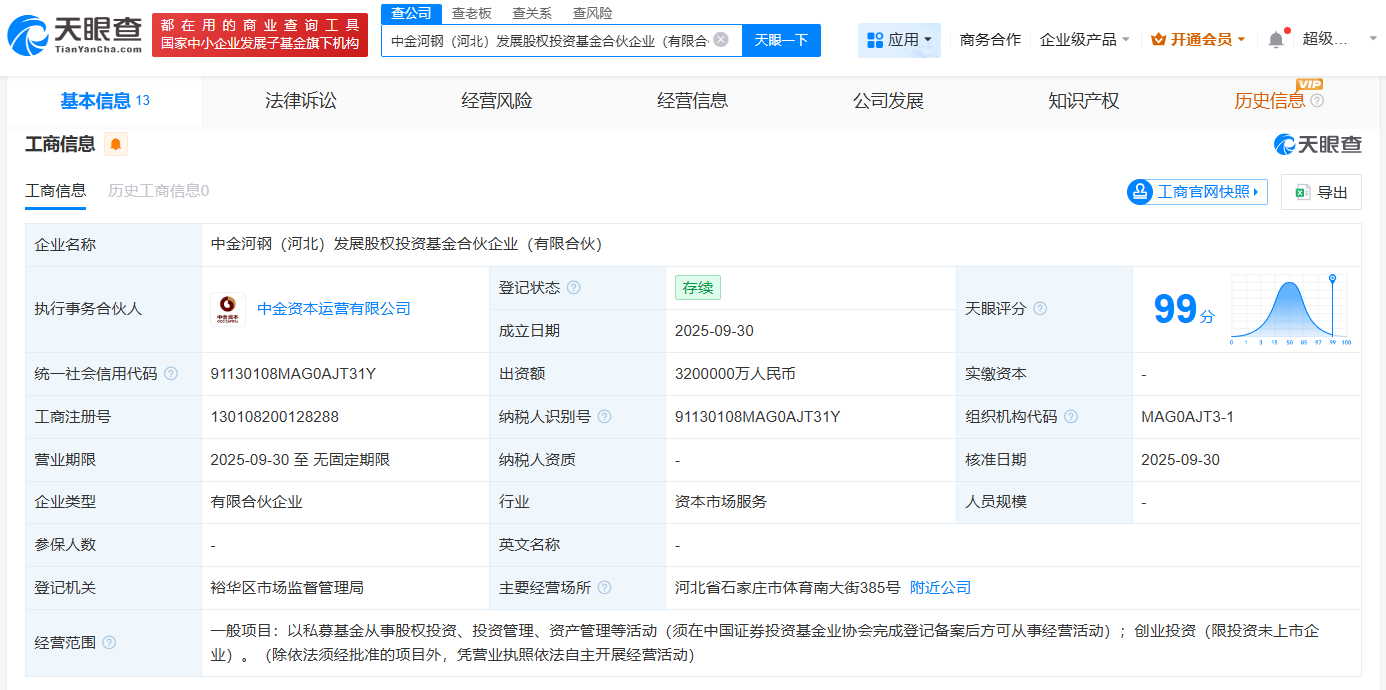 【大河财立方消息】 天眼查App显示,近日中金河钢(河北)发展股权投资基金合伙企业(有限合伙)设立,出资额320亿元,经营范围包括创业投资,以私募基金从事股权投资、投资管理、资产管理等活动;创业投资(限投资未上市企业)。
