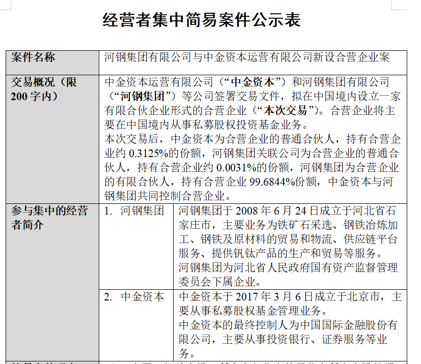 8月28日,北京市市场监督管理局公示经营者集中案件,河钢集团与中金资本新设合营企业案获得无条件批准。公示称,中金资本和河钢集团等公司签署交易文件,拟在中国境内设立一家有限合伙企业形式的合营企业。合营企业将主要在中国境内从事私募股权投资基金业务。交易后,中金资本为合营企业的普通合伙人,河钢集团关联公司为普通合伙人,河钢集团为有限合伙人,中金资本与河钢集团共同控制合营企业。