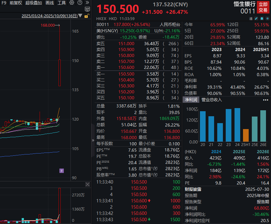 【大河财立方消息】 10月9日盘中,恒生银行股价大涨26.47%,报150.5港元/股。