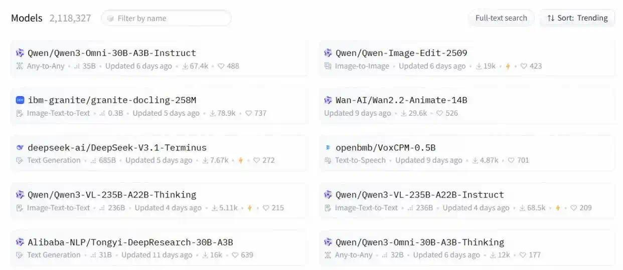 9月28日,全球最大AI开源社区Hugging Face正式发布2025年第三季度模型榜单,阿里通义实验室旗下共7款大模型成功入选“全球前十开源模型”