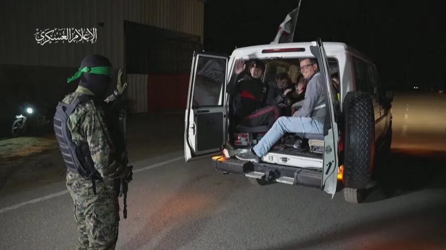 ▎在2023年11月27日哈马斯发布的视频中,哈马斯战士将人质移送给加沙红十字会。图源:CNN