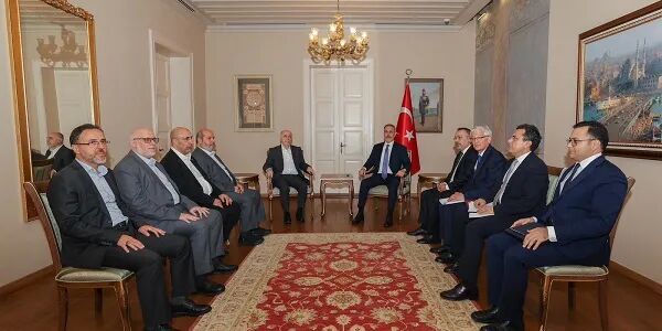 ▎ 2025年8月1日,土耳其外交部长哈坎·菲丹在伊斯坦布尔会见了以哈马斯协商委员会主席穆罕默德·达尔维什为首的代表团。图片来源:土耳其外交部