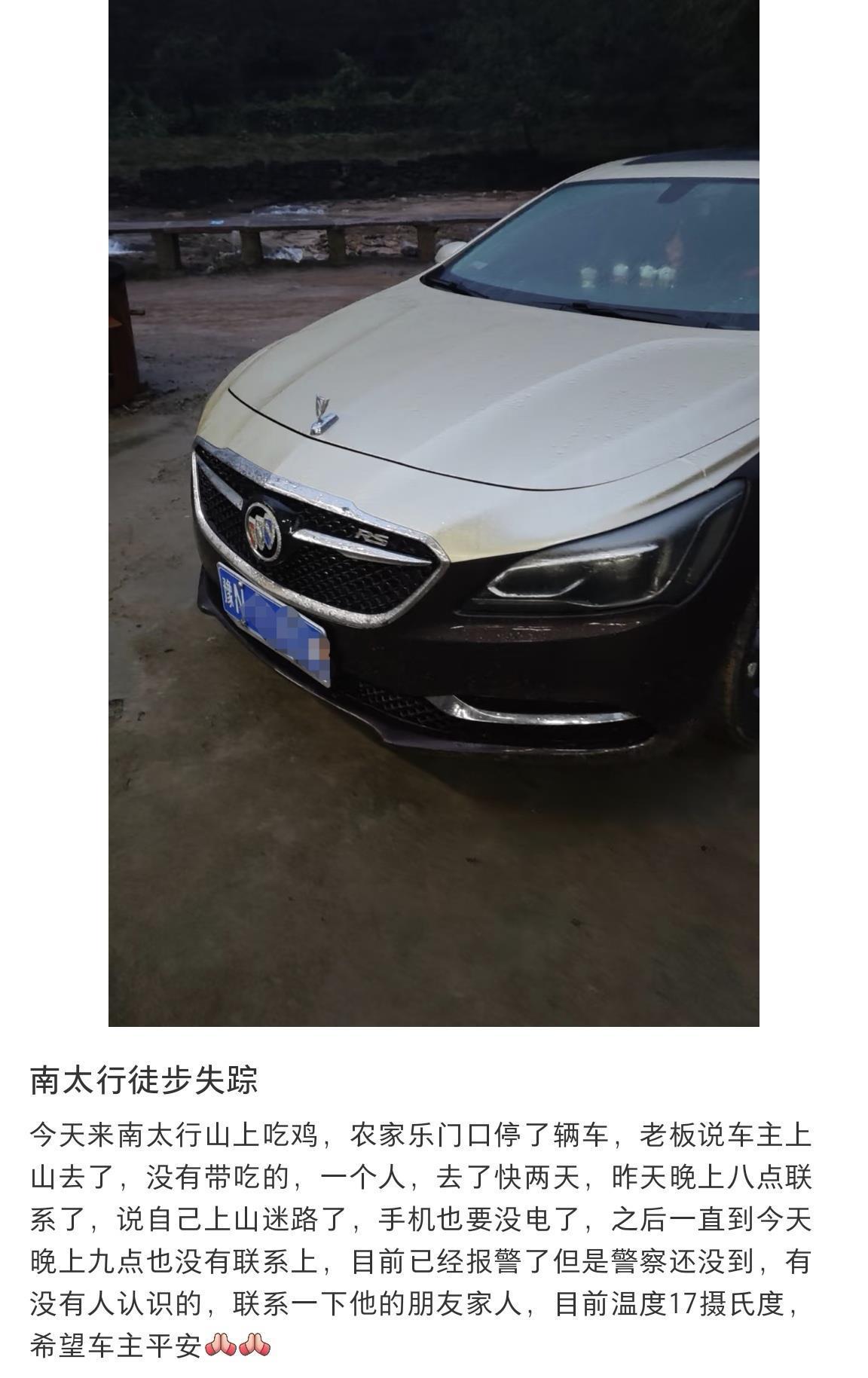 该网友还配发了失联者停在农家乐门口的车辆,询问有没有人认识的,联系一下他的朋友和家人。听农家乐的老板说,这里上下山应该有三四个小时的路程,因为是没有开发的区域,很少有人会往这里来,失联者应该也是平时喜欢爬野山的人,他(失联者)本来打算晚上住这个农家乐,晚上八点了还没下山就给店家打了电话,说自己迷路了,手机又快没电了。