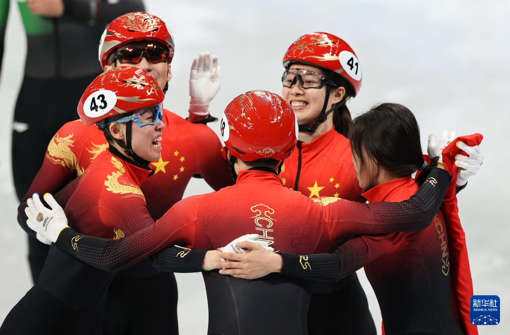 2022年2月5日,在首都体育馆举行的北京2022年冬奥会短道速滑项目混合团体接力决赛中,中国队夺得冠军。这是中国队选手在比赛后庆祝。新华社记者 杨磊 摄