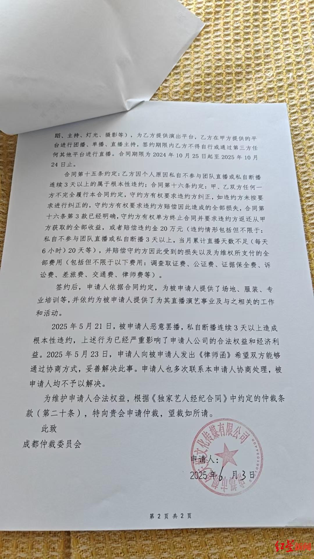 据了解,这些陷入违约陷阱的女孩年龄从15岁至20余岁不等,多为社会经验不足的首次求职者。针对未成年主播,公司甚至直接让其代监护人签字。她们工作期限短则一个多月,长至数月,在职期间有一定的收入,离职后除了收到律师函外,还陆续收到朝鱼公司向成都仲裁委员会提交的仲裁申请,要求每人赔偿2万元至6.5万元不等。