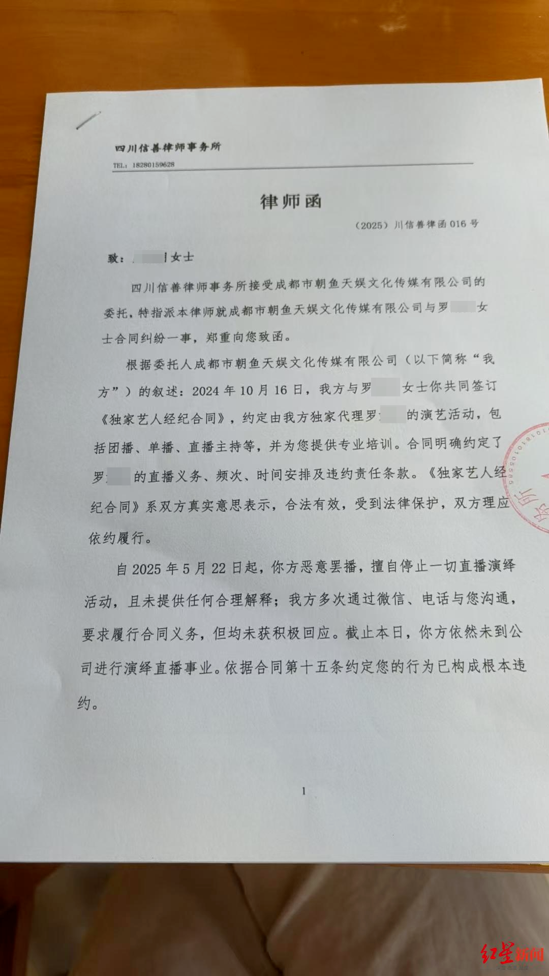 今年年中,不堪忍受的女主播集体离职。随后,她们陆续收到朝鱼公司寄来的律师函,称她们“恶意罢播构成根本违约”,可能因此承担20万元违约金。部分女孩被迫协商,赔偿了数千元。