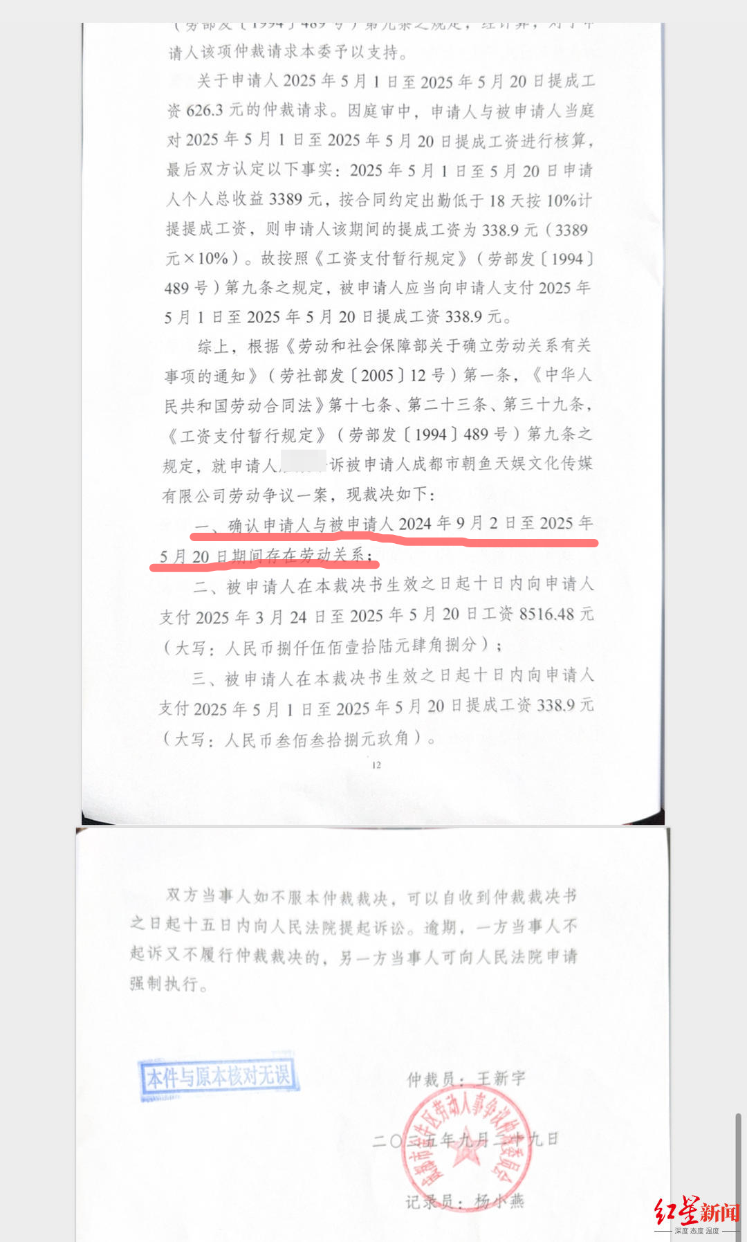 目前,仍有主播正等待劳动仲裁结果。今天(10月9日),其中一名主播拿到了仲裁决定书,认定双方存在劳动关系。