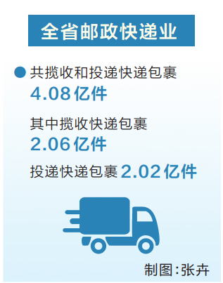 河南日报讯(记者 胡舒彤)10月9日,记者从省邮政管理局获悉,2025年国庆中秋假期期间,全省邮政快递业共揽收和投递快递包裹4.08亿件,其中揽收快递包裹2.06亿件、投递快递包裹2.02亿件。