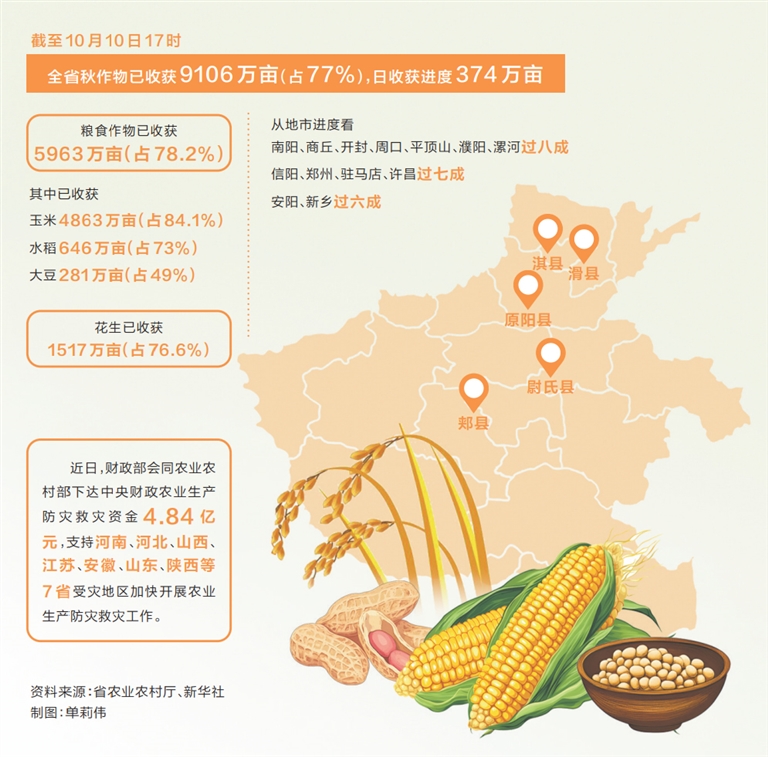 “‘三秋’工作启动以来,县里把抗阴雨、保秋收、稳麦播作为核心任务,启动日调度与日报制,调配新型履带式收割机、建成28个标准化粮食烘干点。同时,组建农业技术指导组分包到村,指导农户开展人工抢收。目前全县玉米已收获七成。”赵向辉介绍。(河南日报三农全媒体中心记者 王侠)