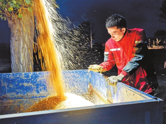 夜幕渐深,田间的收割机仍在作业。明亮的车灯划破夜空,金黄的玉米棒被精准地收入机舱,粉碎后的秸秆均匀撒回田间。陈国安表示,他们将持续跟踪秋收进度,进一步优化农机调度和服务保障,确保剩余玉米能够按期完成收割。