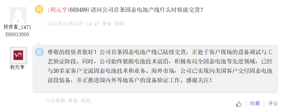 【大河财立方消息】 10月10日,利元亨在互动平台表示,公司首条固态电池产线已陆续交货,正处于客户现场的设备调试与工艺验证阶段。同时,公司始终紧跟电池技术前沿,积极布局全固态电池等先进领域,已经与30多家客户交流固态电池技术和业务。