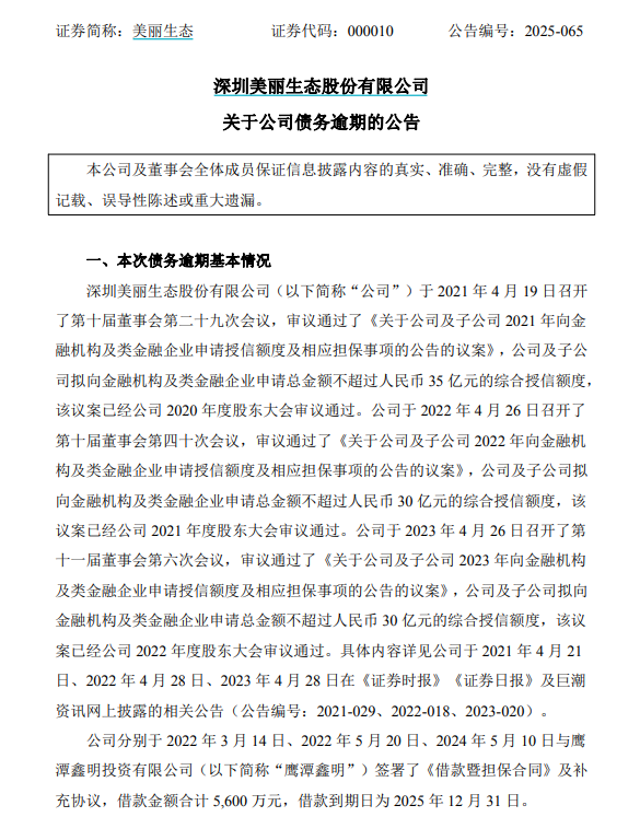 【大河财立方消息】 10月10日,深圳美丽生态股份有限公司(证券简称:美丽生态)公告,近日,收到鹰潭鑫明投资有限公司的债务清偿通知书及提前还款通知书,因未能在指定还款期限还款,公司构成债务逾期。