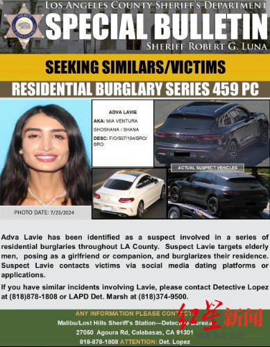美国洛杉矶县治安部门10月8日发布的公告中提到,若发现拉维或其车辆,请立即联系当局:“嫌疑人拉维涉嫌参与洛杉矶县多起住宅盗窃案,她以老年男子为目标,在社交媒体约会平台上假意发展女友或伴侣关系。”洛杉矶县治安官表示,拉维已在个人经历中添加了“逃犯”一词。