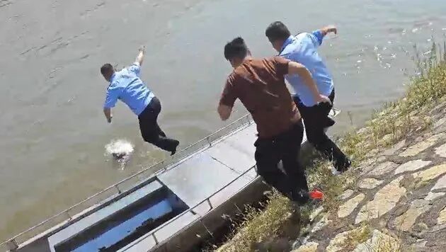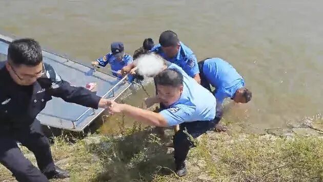“快!在那儿!”搜索中,在场民辅警突然发现了河中的女子。随后,民辅警立刻飞奔至河边。