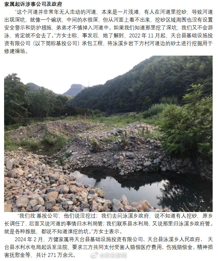 “这个河道并非常年无人走动的河道,本来是一片浅滩,有人在河道里挖砂,导致河道出现深坑,就像一个碗状,中间的水很深,但从河面上看不出来,挖砂区域周围也没有设置安全警示和防护措施,弟弟才不慎掉入河道中。如果我们知道那里挖了深坑,我们又不会游泳,肯定就不会去了。”方女士称,事发后,她了解到,2022年11月起,天台县基础设施投资有限公司(以下简称基投公司)承包工程,将泳溪乡岩下方村河道边的砂土进行挖掘用于修建操场。